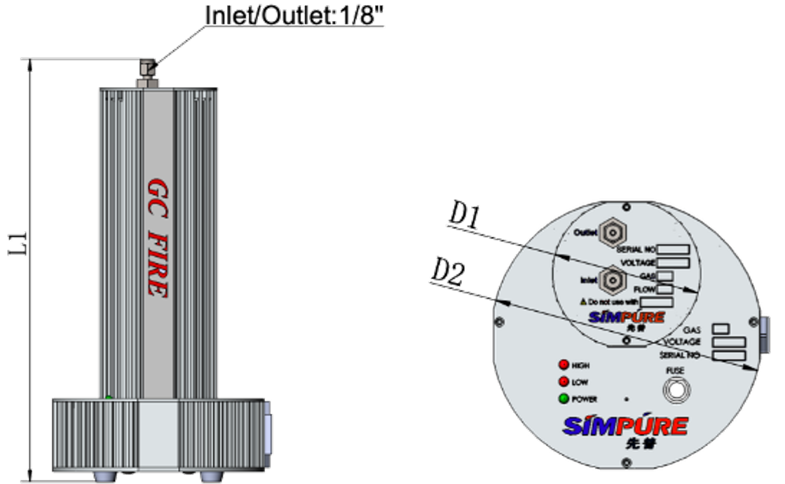 GC Fire系列烷烃燃烧器由纯化单元和电控单元两部分所组成。纯化单元主要由催化剂(Catalyst)单元、气体管路和加热器所组成。纯化器采用催化的方法在高温下将含氧气体中的碳氢化合物转换成H2O和CO2,从而达到将碳氢化合物去除到小于10ppb以下的目的,并且在316L不锈钢罐体中内置了过滤精度为1微米的颗粒过滤器。电控部分负责控制纯化器的温度和安全报警等过程,确保纯化器能够持续安全稳定地运行。